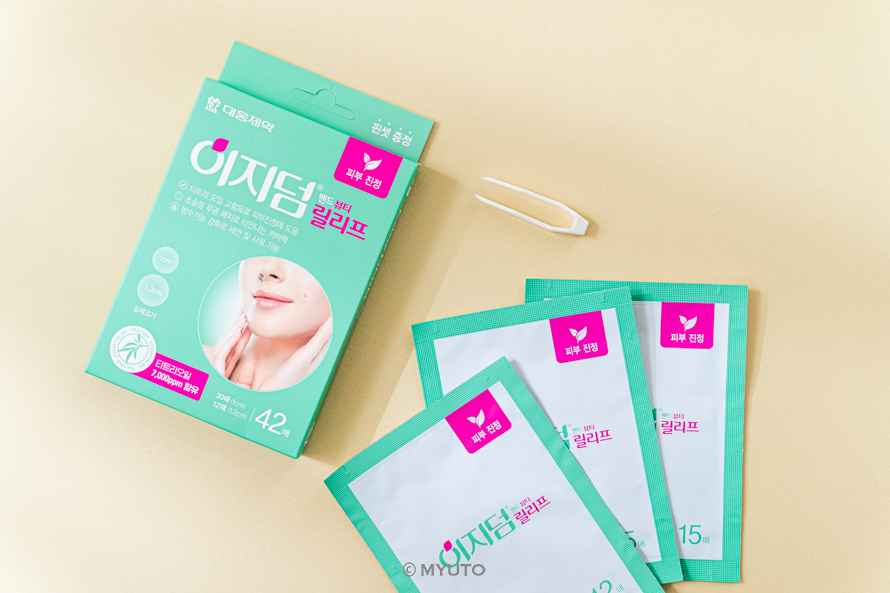 먼저 신제품인 이지덤 뷰티 릴리프는 이름처럼 피부진정/완화를 위한 패치 제품이에요. 여드름이 났지만 아직 농익지않고 붉게 보이기만 하거나, 화이트헤드같은 폐쇄성 면포에 사용하면 되는 제품이구요, 각질 제거 및 진정 성분으로 염증이 더 심해지기 전에 피부를 진정시켜주는 제품이라고 보면 될 것 같아요. 모양은 원형의 매끈한 패치이고 제가 들고잇는 1cm 크기가 30매, 1.2cm 가 12매 들어있어 총 42개가 포함된 제품이랍니다.
