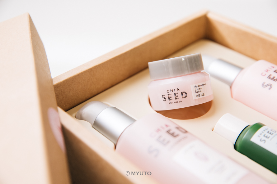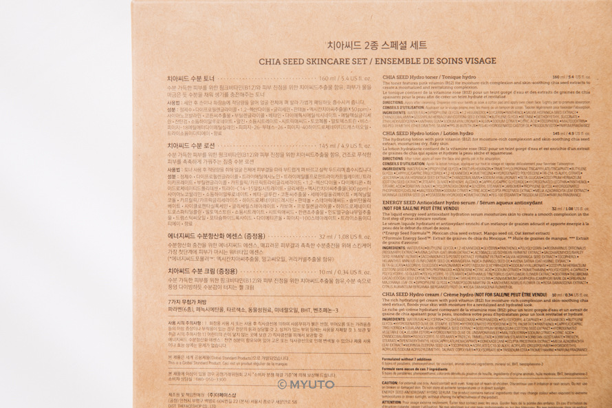 먼저 살펴볼 제품은 치아씨드 추출물이 들어간 스킨케어 라인 2종 세트로, 토너+로션이 들어있고 샘플사이즈의 수분크림, 에너지씨드 에센스가 들어있어요.