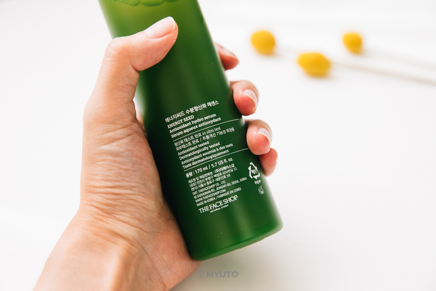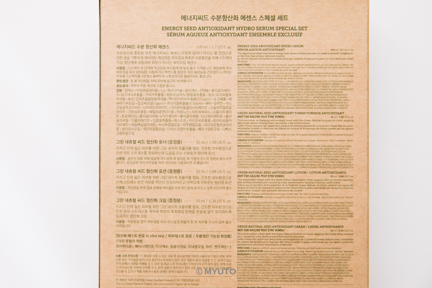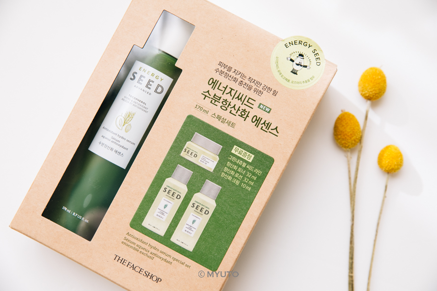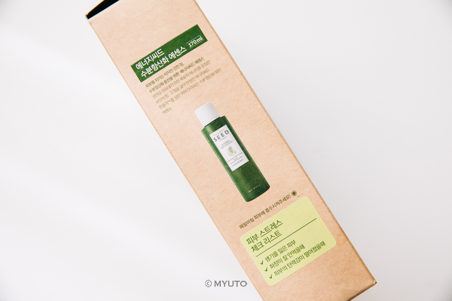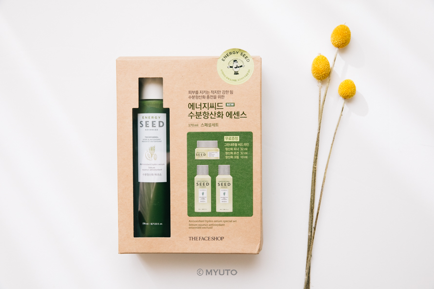 다음으로 살펴볼 제품은 에너지씨드 수분항산화 에센스 기획세트랍니다. 이 제품은 위의 치아씨드라인에도 샘플로 들어있었죠? 치아씨드외에도 망고씨드, 귀리 등 여러 씨앗의 영양을 담은 제품이라고 하네요. 일반적으로는 에센스를 토너 다음단계에서 사용하는데, 이 제품은 스킨케어 ' 첫단계 ' 에 사용하는 에센스에요.