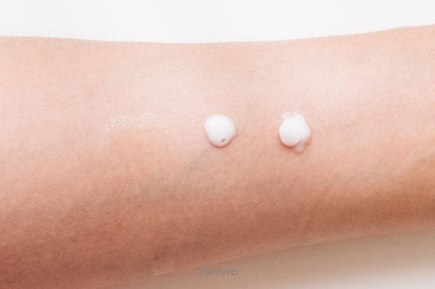 먼저 제형비교샷인데요, 순서대로 토너-로션-수분크림이에요. 수분크림은 본품은 아니지만 같은 치아씨드라인이라 비교를 위해 올려보았는데요, 토너는 팔에 올리면 주르륵 흘러내리는 묽은 워터타입이고 수분크림은 로션보다 아주 약간 점성이 있는 정도의 제형이었어요.