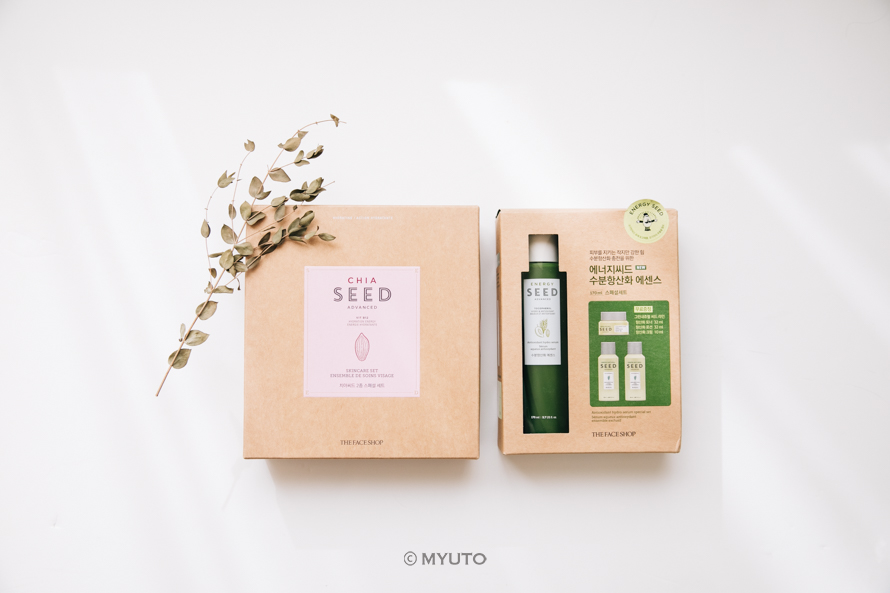 본품 외에도 다른 제품들을 테스트해볼 수 있게 (하지만 본품과 함께 쓰기좋게 엄선한 라인으로!) 넉넉히 샘플이 들어있는 것도 마음에 들구요. 이번에 리뷰해볼 제품은 더페이스샵의 치아씨드 2종 스페셜세트와 에너지씨드 에센스 기획세트에요.